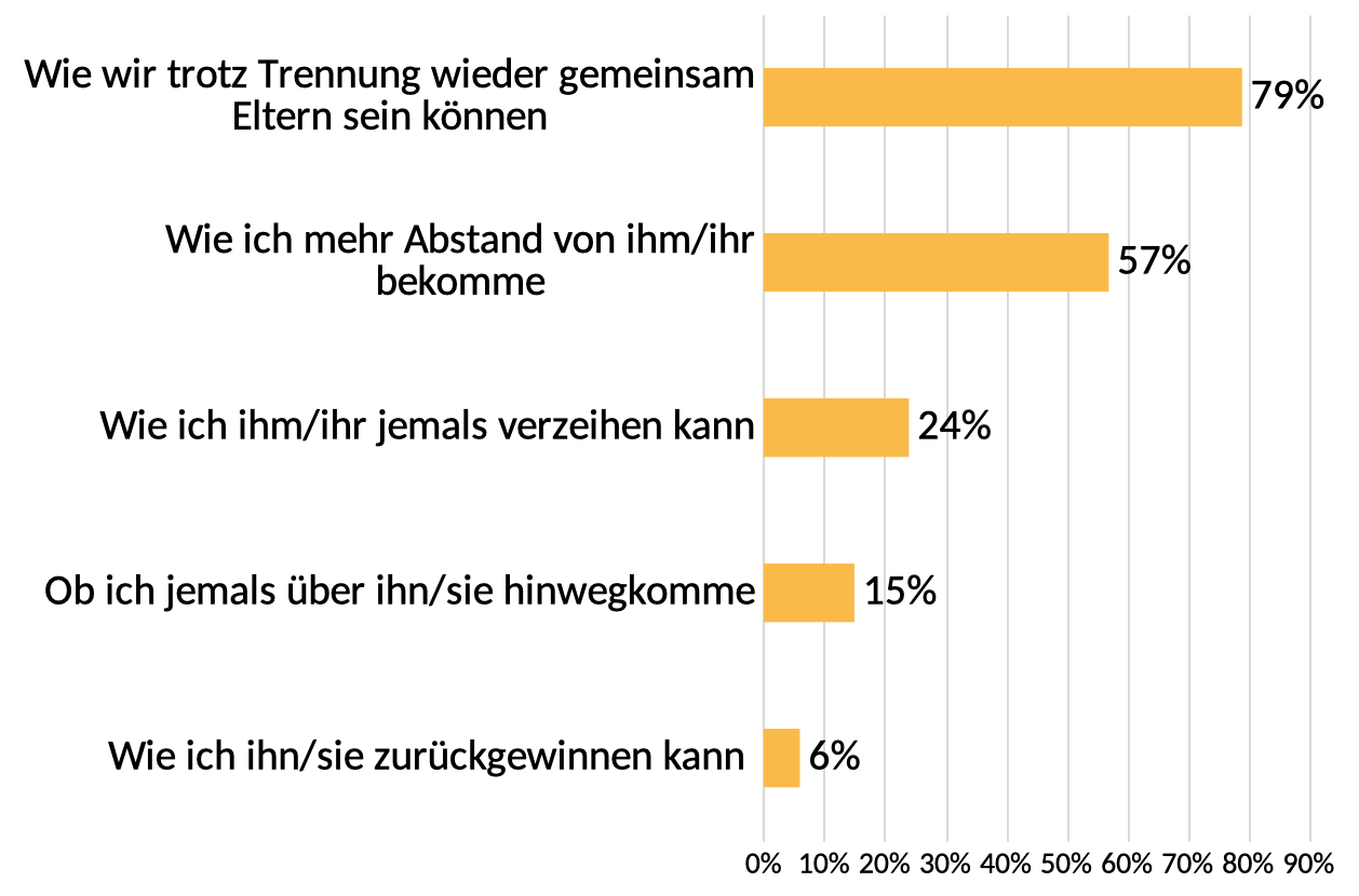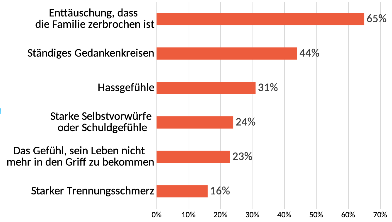 Meist erleben Menschen bei einer Trennung allerdings sehr belastende – teils auch gegensätzliche – Gefühle. Viele Getrennte empfinden z.B. eine starke Traurigkeit darüber, dass die Beziehung gescheitert und die Familie zerbrochen ist, oder machen sich Sorgen um die Zukunft. Man fühlt sich oft einsam, verunsichert und verletzlich und gleichzeitig fehlt die Person, an die man sich sonst gewandt hat, wenn man jemanden zum Reden oder eine Schulter zum Anlehnen gebraucht hat. Zudem verschwinden die Gefühle von Zuneigung und Liebe in der Regel nicht von einem Tag auf den anderen. Viele Menschen vermissen die Ex-Partnerin oder den Ex-Partner schmerzlich. Sie kreisen um den Gedanken, wie sie sie oder ihn zurückgewinnen können, oder fragen sich, ob die Gefühle und Gedanken jemals nachlassen.