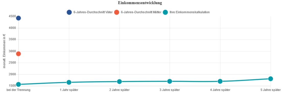 Der orange Punkt kennzeichnet das durchschnittliche Einkommen aller Mütter, die sich in derselben Alterskategorie wie Jennifer befinden, über die sechs Jahre hinweg, die der Trennung folgen. Es liegt bei ca. 2.888 €. Bei Vätern in derselben Alterskategorie – gekennzeichnet durch den blauen Punkt – liegt das Durchschnittseinkommen über die Nachtrennungsjahre bei ca. 4.420 €.Die türkisfarbige Linie: