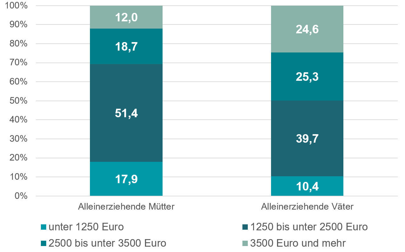 In der Folge liegt das Haushaltseinkommen von Müttern nach der Trennung oft deutlich unter demjenigen von Vätern. Bei 17,9 % der Mütter mit minderjährigen Kindern im Haushalt, aber nur bei 10,4 % dieser Väter liegt es unter 1.250 € (Jahr 2021). Weitere 51,4 % der Mütter müssen mit einem Nettohaushaltseinkommen zwischen 1.250 € und 2.500 € auskommen, bei den Vätern ist das nur für 39,7 % der Fall. Stattdessen verzeichnen alleinerziehende Väter häufiger ein Haushaltsnettoeinkommen zwischen 2.500 € und 3.500 € (das gilt für 25,3 % der Väter, aber nur für 18,7 % der Mütter) oder sogar von über 3.500 € (24,6 % der Väter versus 12,0 % der Mütter).